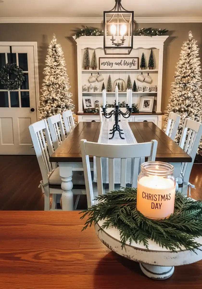 This first space feels like winter at a farmhouse café. A chunky wood table, simple runner, and a black candelabra do all the talking while two flocked trees stand like gentle bodyguards. The white hutch with mini trees and a “merry and bright” sign keeps the palette quiet. I love how neutral christmas decor makes the candles glow warmer and the wood tones richer. It is calm without being boring, and I promise your dinner rolls will taste fancier in this light.