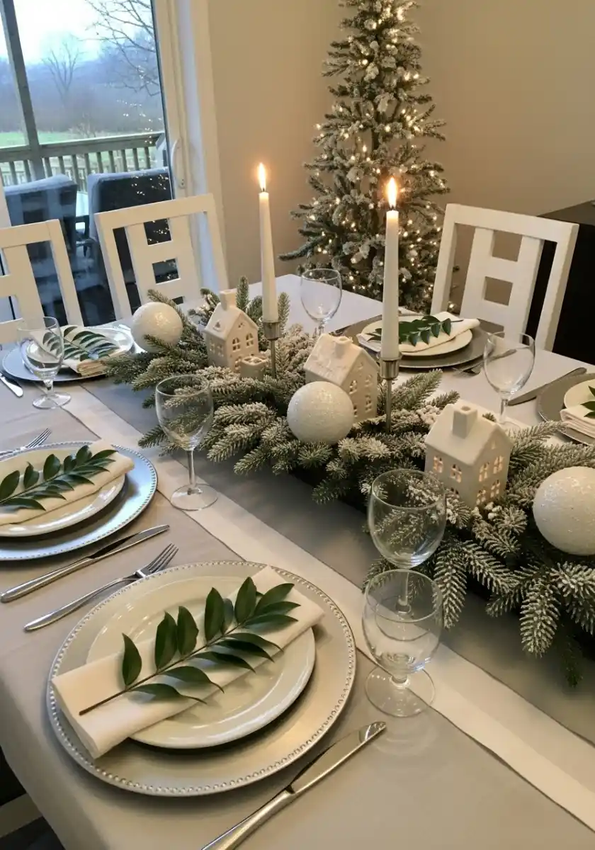Try a baking sheet under your runner to catch any flocking mess, then slide it out after dinner. The ceramic houses double as night lights on a shelf later, so they earn their keep. Keep glassware clear and shapes clean for a minimal holiday look. If your dining room opens to a patio, let the tree by the door echo the same vibe with tiny warm lights and nothing else.