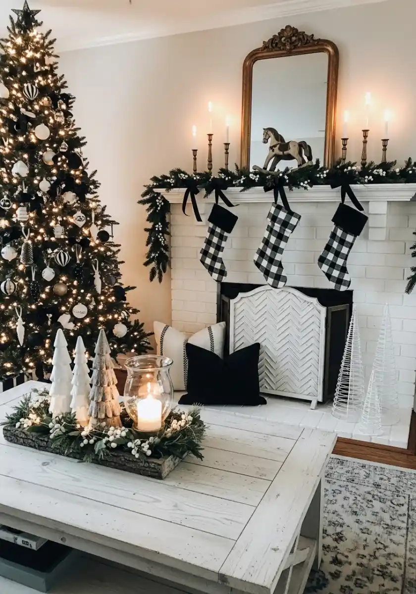The room is that classic living room with the white brick fireplace, a full tree, and those bold black and white stockings. It’s simple, but it looks intentional. What makes this neutral christmas decor work is the limited palette. We’ve got white, black, deep greens, and warm candlelight. If your mantel feels flat, layer a lush evergreen garland first, then tuck in white berries and a few satin black bows. I promise the bows are doing more work than you think. They echo the stockings and bring the whole mantel into one family.