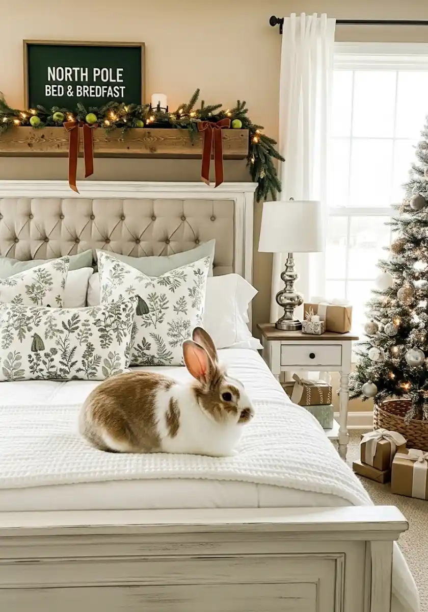I laughed at the “North Pole Bed & Breakfast” sign because I would 100 percent hang that. The trick here is symmetry and scale. A chunky shelf with garland and two rust ribbons frames the tufted headboard so the bed becomes a grand moment. Keep bedding mostly white, then add botanical pillows that read soft sage. This is neutral Christmas decorations with a touch of nature, and it calms the room like a breath of cold air.