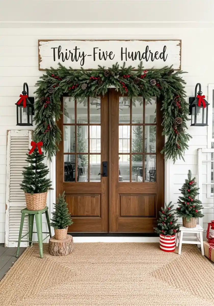 I’m picky about porches, and this one nails warm neutral holiday style. The door is rich wood, which already feels cozy, so the thick garland draped around it just needed pinecones, a few red berries, and satin bows. If your door is dark or wood, go heavy on texture and keep ornaments off the garland. That keeps the silhouette clean. Use two potted mini trees at different heights. That height change is the whole secret.