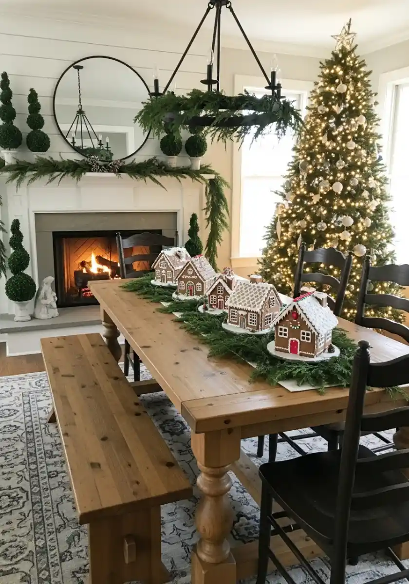 This table made me grin like a kid. A line of gingerbread houses marching down a bed of cedar is charming and actually doable. Start with a linen runner, then lay faux greenery the long way. Set each house on a white cake stand or a plate so they look intentional, not plopped. The living room tree and fireplace in the background share the same calm Christmas palette of gold and white, so nothing fights for attention.