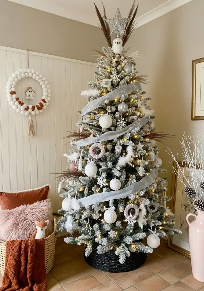 This tree is like a snow cone for grown ups. Flocked branches, silver ribbon that winds gently, and soft blush ornaments. It’s modern neutral Christmas look but still sweet. Start with the ribbon. Cut lengths, pinch in the center, and tuck each section, rather than wrapping a single long ribbon. It gives that professional ripple you see in the photo. Then add white and pale pink ornaments in large to small scale.