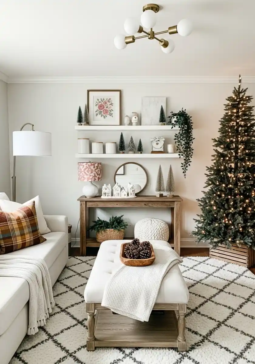 If you want Scandi but not cold, choose one warm texture per surface. A knit on the sofa, a woven basket on the floor, and a wood toy by the tree. Stop there. Keep ornaments simple for Scandinavian Christmas neutrals, maybe wooden beads and white balls. The room will feel airy but still lived in.