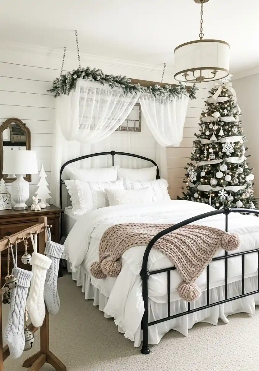 Keep the room light and airy. Sheer curtains let winter light in and the pale rug softens the floor. Use brass candle sticks, a stack of green books, and a little garland on the dresser to pull the eye across the space. I learned that low contrast is calming. Lots of white, touches of cream and sage. That’s quiet Christmas neutrals. If you want a personal note, hang one family photo in black and white on the dresser mirror. It stays neutral but still yours.
