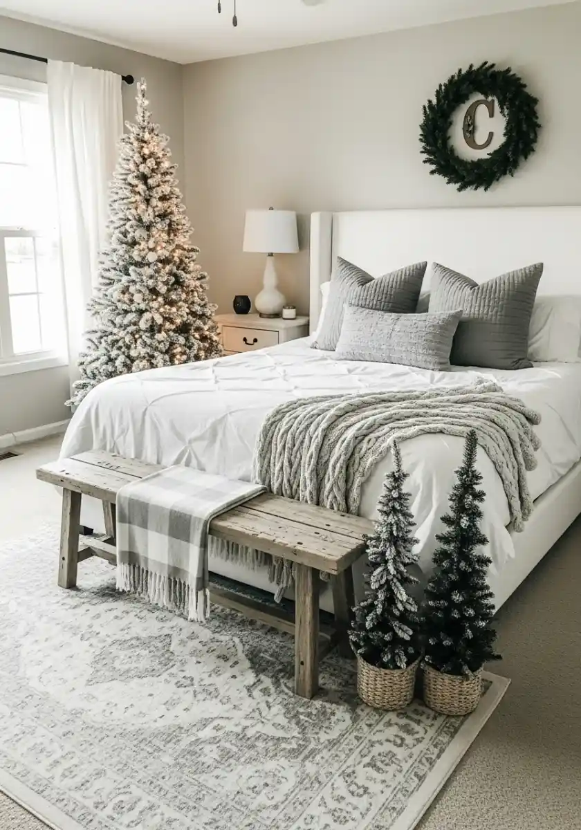 If your partner says they don’t like extra color, this is the blueprint. Keep the bed dressed in white with gray pillows in three sizes. Add a cable knit throw at the corner, and place a rustic bench at the foot. Two small potted trees on the floor give symmetry without clutter. The single wreath above the headboard with an initial is personal and cute without getting loud.
