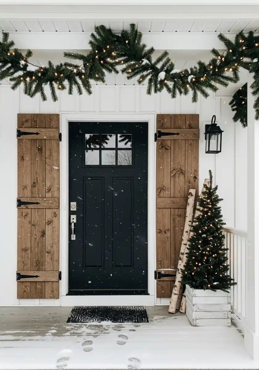 Snowy steps, black door, and chunky garland. It’s a quiet scene and I love the confidence of it. If you don’t have space for lots of stuff, do three things well. One thick garland with lights, one slim tree in a crate, and one bundle of birch logs. The wood shutters make it read rustic and the lights keep it festive. That’s natural Christmas decor the neighbors will copy.