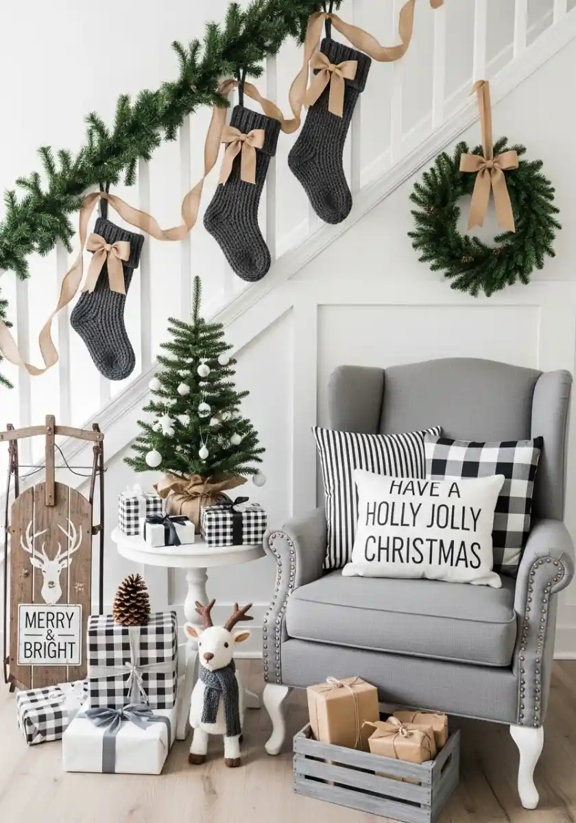 This staircase nook is smart. Charcoal knit stockings with tan ribbon read classic but modern. A small tree, buffalo check gifts, and a cozy chair with striped pillows tie it together. This is what I call neutral holiday decor with personality. The trick is contrast. Gray plus warm taupe equals instant balance.
