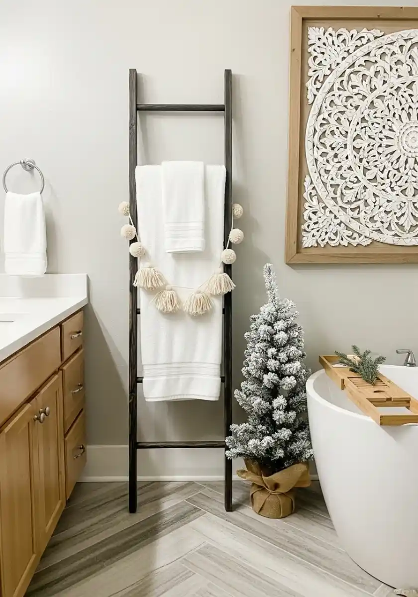 If your bath is small, try a tabletop tree or even a bundle of real cedar in a vase. Add a wooden bath tray for candles or a book. That gives a cozy neutral winter decor vibe with almost no effort. Bonus, you can keep the ladder year round. It’s useful and pretty, which is my favorite combo.