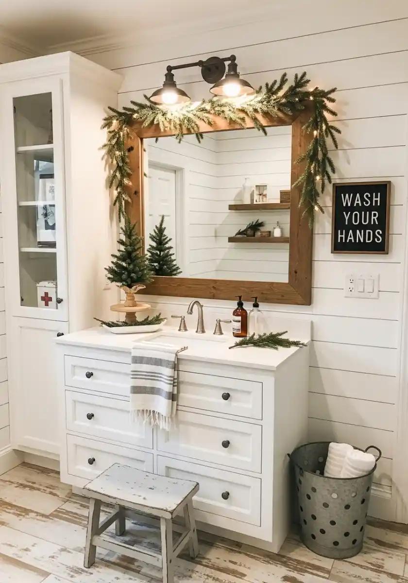 Farmhouse vanity with mirror garland and mini trees