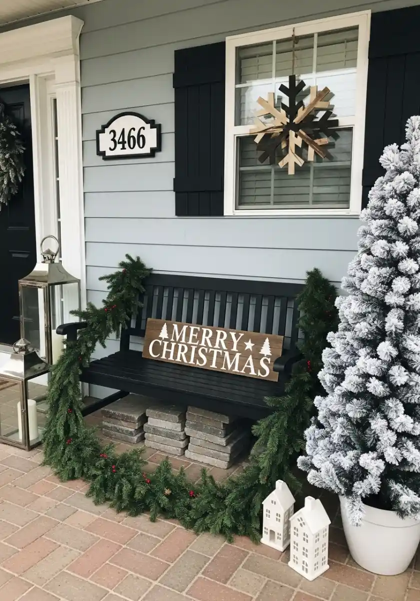 Front porches love restraint. This bench vignette proves it. A thick garland swoops across a black bench, a big wooden snowflake hangs in the window, and a flocked tree in a white pot balances the other side. I used brick pavers under my bench to raise it a tiny bit like the photo. It sounds silly, but the height makes the garland fall right and feel rich. Minimalist Christmas neutrals for the win.