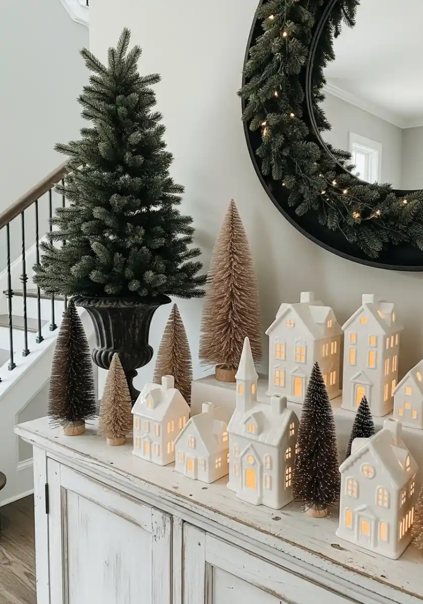 Make the lights feel soft. I drop battery tea lights inside each house and switch to warm bulbs on the wreath. Keep the tree colors tonal, not matchy. That blend gives natural Christmas decor depth and makes the whites look whiter. One more thing. Put the tallest tree right under the mirror edge, and the reflection fakes extra height. It’s a tiny hack, but it photographs so good.