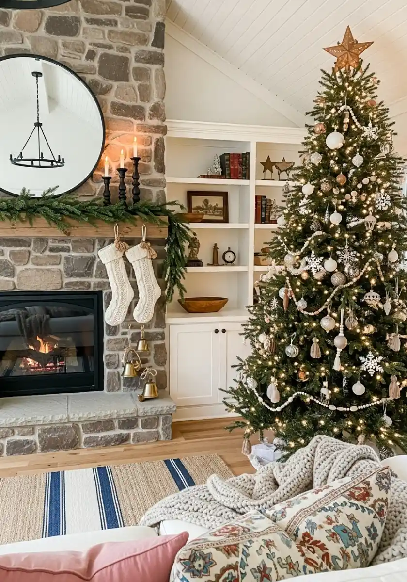 I’ll be honest, I tried bright red here first and it felt noisy against the stone. Switching to a calm Christmas palette of white, cream, and warm brass changed everything. The room went from busy to peaceful in one hour. If you want more shine, choose only one metallic. I like antique brass. Two metals can look fussy in rustic rooms. Keep it cozy with a chunky throw tossed on the sofa, not folded perfectly. Imperfect looks real.