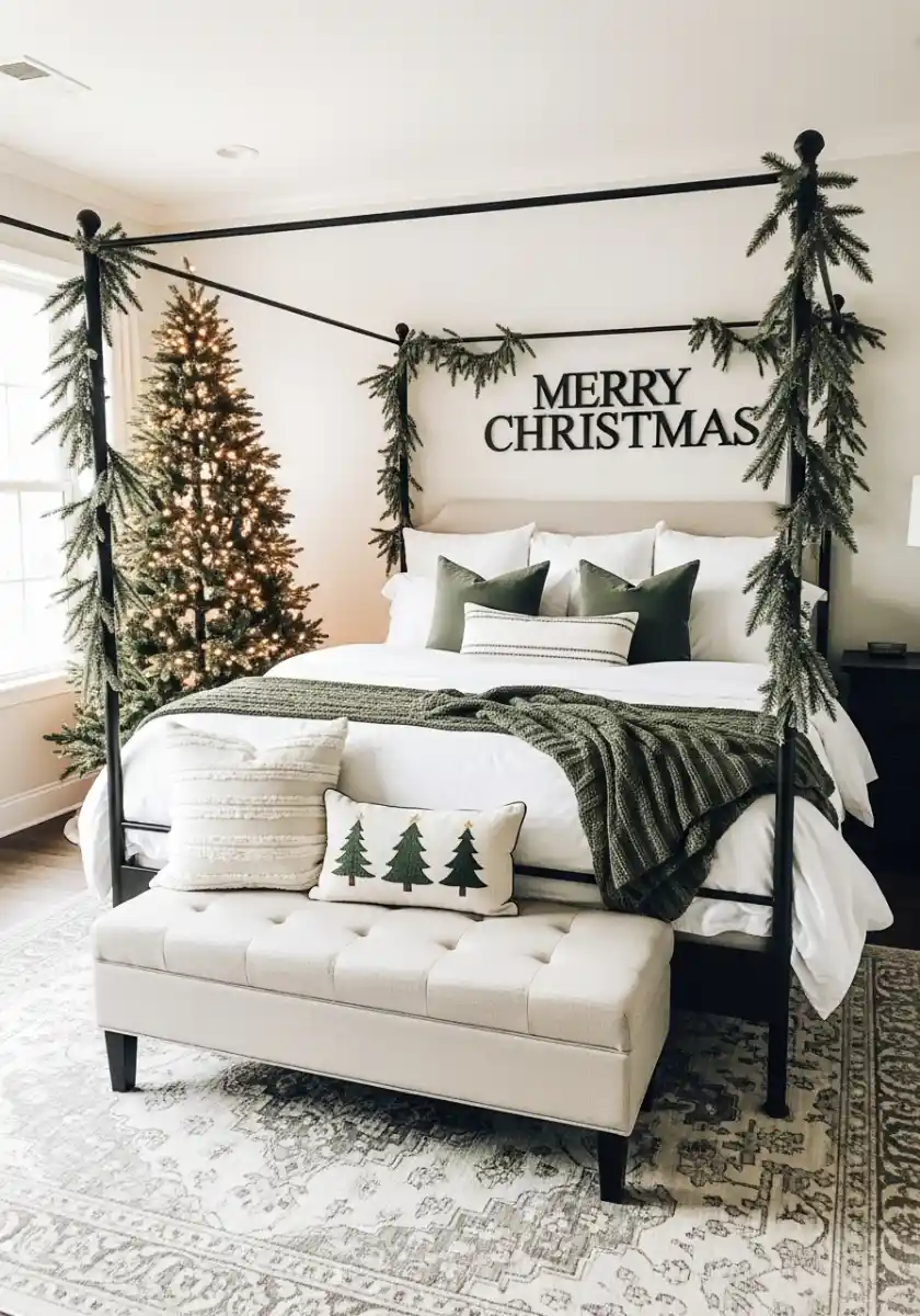 A canopy bed is basically a stage for neutral holiday decor. I draped a sparse garland along the frame, letting tips hang down like soft fringe. The bed stays all white, then I add three forest green pillows and a matching knit blanket. Behind the headboard, big letters spell Merry Christmas and echo the black bed frame. It’s bold without leaving the neutral lane.