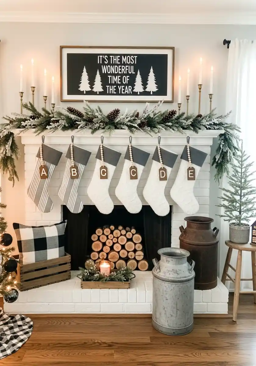 This mantel is crisp and graphic and a little playful. Frosted greenery runs across the top, and five stockings hang in a neat row with letter tags. Candles on tall brass holders flank a black and white sign. It’s a very tidy take on neutral christmas decor, perfect if you like order and straight lines as much as I do.