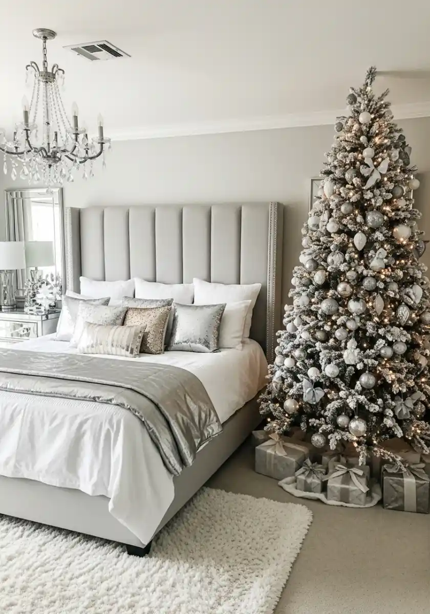Glam gray bedroom with silver tree and chandelier sparkle
