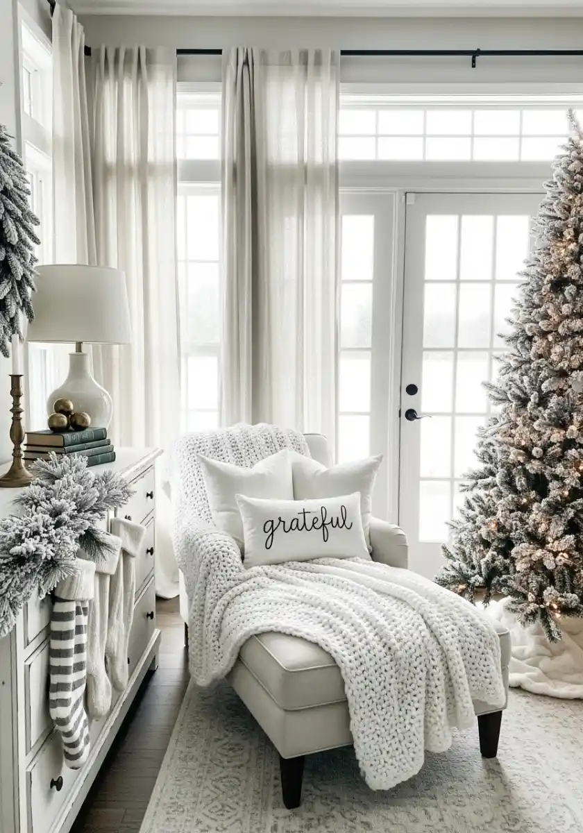 This corner honestly made me want to cancel plans and live under a blanket. A chaise holds a chunky knit throw and the sweetest “grateful” pillow. A flocked wreath and a few stockings dress the cabinet. Nearby stands a full flocked tree with warm lights only. This is muted Christmas decor that invites naps, and I say yes.
