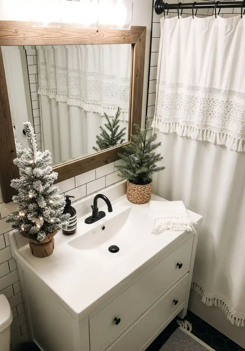 Tiny bathrooms can handle Christmas if you keep it simple. On the small vanity, I placed two mini trees, one flocked and one natural, in humble baskets. The mirror is framed in warm wood, and the white shower curtain has pretty lace trim. Together these textures create neutral christmas decor that doesn’t steal space or cause morning chaos.