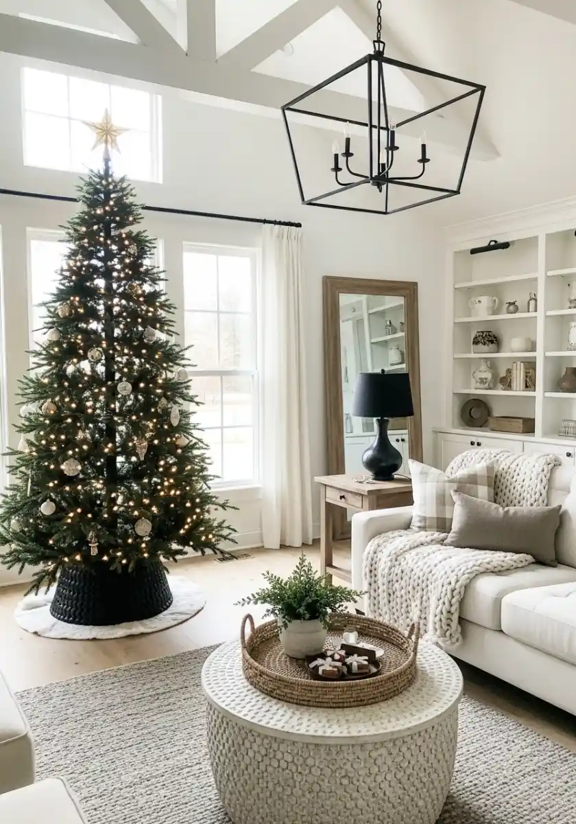 This living room was built for nap season. A tree with simple lights, a woven tray, knit throw, and a few metallic ornaments. The palette leans oatmeal and soft gray, which is my favorite neutral christmas decor recipe because it works with any wall color. I also notice black lines in the light fixture and curtain rod. Those crisp lines stop the room from floating away.