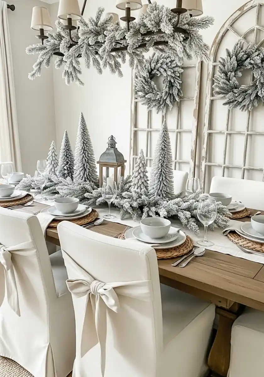 This table looks like a snowy forest decided to host brunch. Flocked mini trees march down the center, and two wreaths hang over vintage window frames. Slipcovered chairs with big bows are the statement. Here neutral christmas decor takes shape with layers of white on white, broken by natural wood. It feels fancy but not stiff.