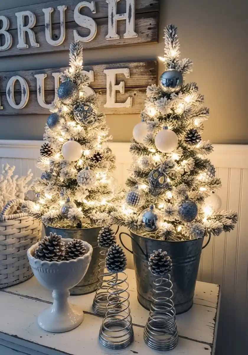 Here’s the hack. If you can’t find buckets that fit, flip a bowl inside the bucket to raise the tree base. Wrap the trunk with scrap fabric. Keep ornaments to white, silver, and a few check patterns for muted holiday decor that still has texture. I’d use this setup on a dresser too, just watch the lamp cords. Safety first, style second.