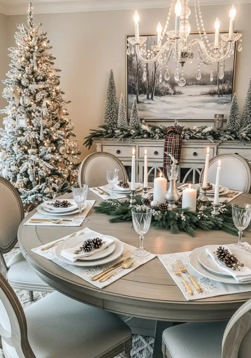 Round tables can be fussy, but this one nails the scale. A wreath runner with pillar candles sits low, so conversation is easy. Gold flatware and a crystal chandelier add sparkle without screaming. The sideboard carries a snowy garland and tall trees. I’m a big fan of how neutral christmas decor lets metal finishes shine in a classy way.
