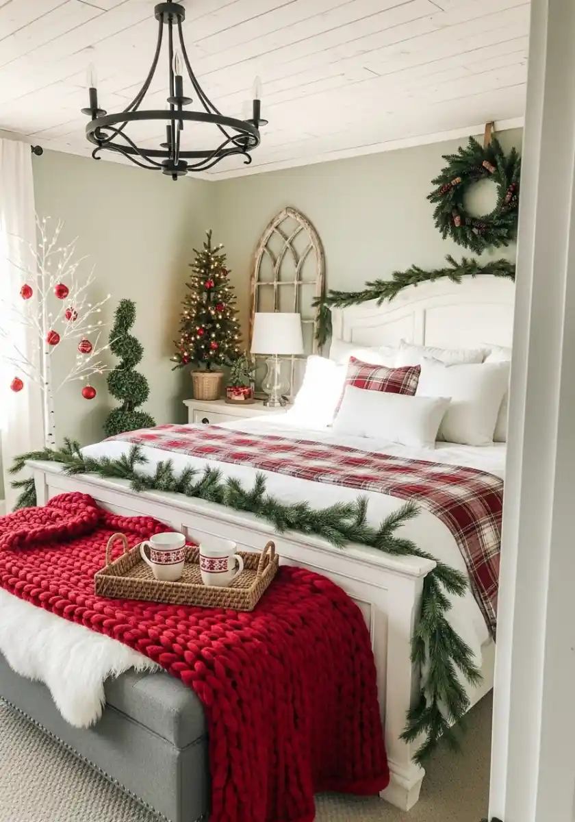 Okay confession. I’m usually team beige all December. Then I saw this room and remembered why red exists. The base stays neutral with white bedding, green garland, and soft walls, but the plaid quilt and chunky red throw make it feel movie-night ready. This is neutral christmas decor with a controlled pop.