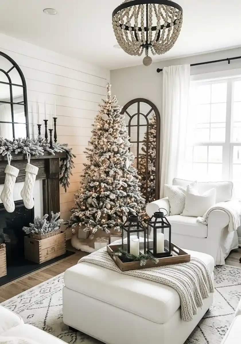 Here’s the vibe: shiplap, mirrors, a snowy tree, and two chunky lanterns on an ottoman tray. The fireplace garland is frosty, the stockings are creamy, and everything feels like a peaceful weekend. What works is the small doses of black. They define the space and make the whites look brighter. It’s a textbook neutral christmas decor move.