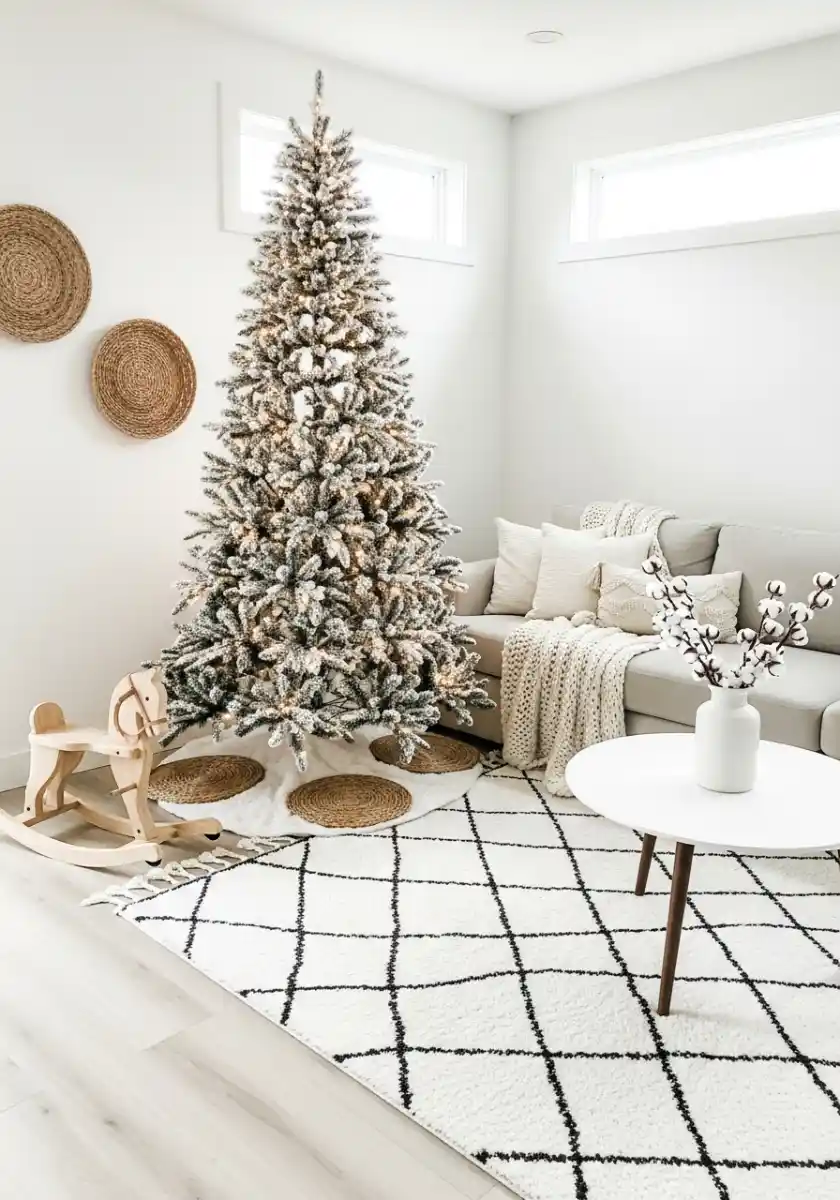 This one is bare in the best way. A tall flocked tree, a white and black rug, cotton stems in a vase, and woven wall baskets. It’s bright, friendly, and kid proof. The rocking horse made me smile. It gives the space a story. The color story is snow and oatmeal with tiny graphite lines. That’s good neutral christmas decor discipline.