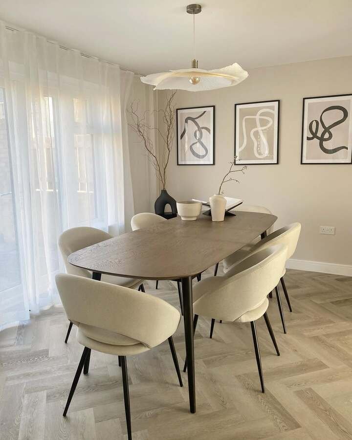 This first setup is so clean it almost makes me want to whisper. The oval dining table has that smooth gray finish, paired with creamy upholstered chairs that look comfy enough to sit for hours. And the black legs keep everything grounded so it doesn’t float away into “too delicate” territory. The abstract prints on the wall are simple, but they still feel artsy, like the room has taste but isn’t trying too hard.