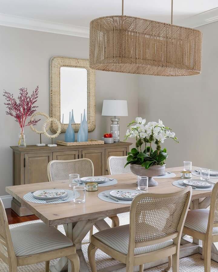 This room has that coastal-but-not-too-beachy feel, and it’s mostly because of the big woven drum chandelier. It hangs low and makes the whole space feel collected and warm. The table is light wood, simple lines, and those cane-back chairs bring in airy texture without making it look fragile. It’s a classic neutral dining room decor setup that still has personality, which is honestly hard to pull off.