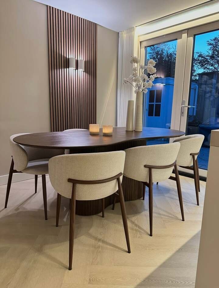 This one is darker and smoother, like a fancy restaurant but you can still wear socks. The deep wood oval table feels serious, and the chairs are soft and light so the room doesn’t get heavy. That slatted wall panel behind the table adds texture without needing art, and the simple sconces make it feel sleek. This is neutral dining room decor with a little edge, and I’m kind of obsessed.