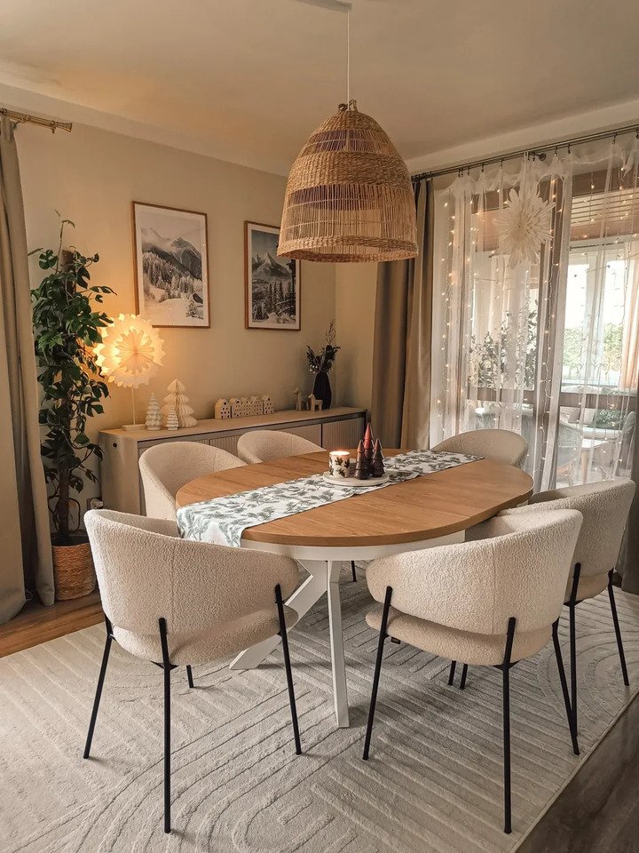 This room feels like it smells like cinnamon, even though I can’t actually smell pictures. The lighting is warm, the woven pendant is big and cozy, and the table is oval with a runner that adds pattern without screaming. The chairs are that teddy boucle fabric with slim black legs, which is such a good mix of soft and sharp. It’s neutral dining area decor that feels like you can sit there forever and talk about nothing.