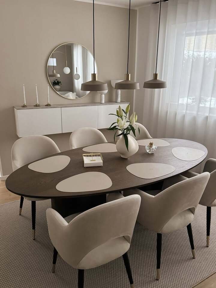 This one is clean in a way that makes me want to straighten my own house, which is rude. The dark oval table is the anchor, and the chairs are light and soft so your eyes don’t feel tired. The three matching pendants lined up over the table look neat and balanced, like everything’s in its right spot. The white sideboard and round mirror keep the wall simple but not empty. This is neutral dining room decor that’s tidy, calm, and a little fancy.
