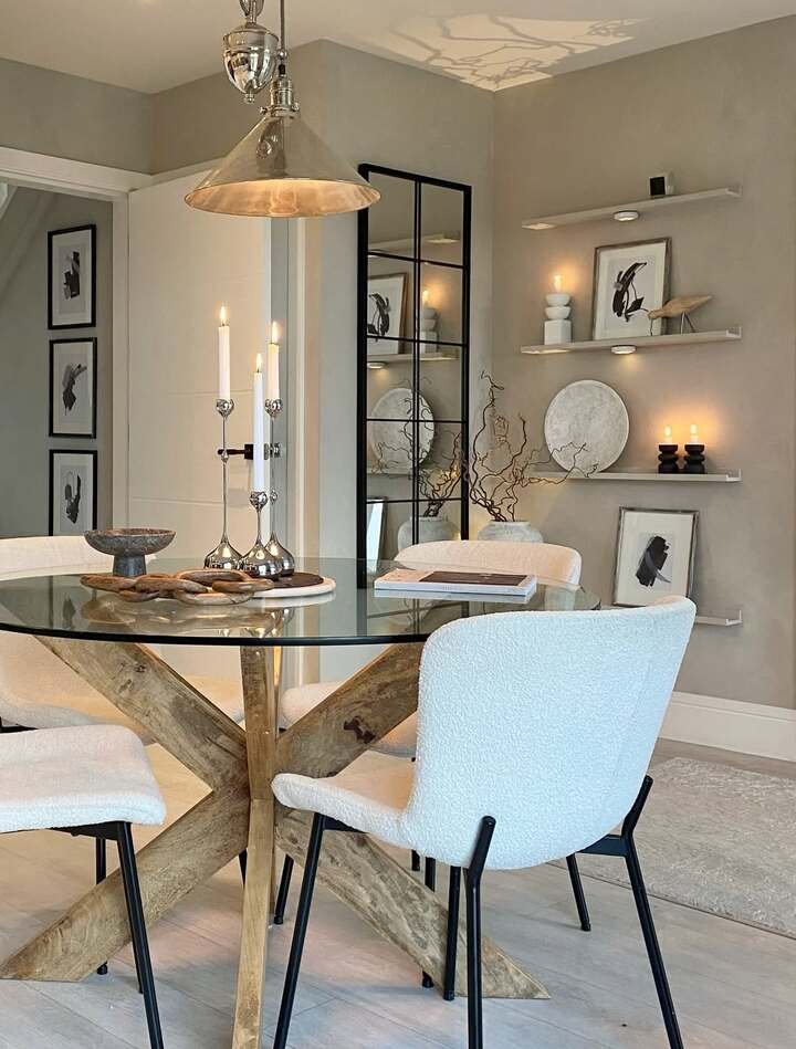 This room mixes “modern” and “rustic” in a way that weirdly works. The glass table keeps it light, but the chunky wooden X-base brings warmth and texture. The chairs are that soft boucle again, and the black legs add structure. Then you’ve got the open shelves with plates, vases, and candles, which adds personality without needing a big gallery wall. It’s neutral dining room decor with layers, not just plain beige everywhere.