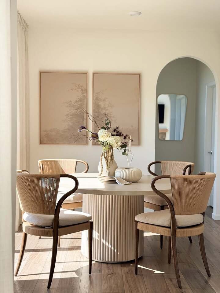 This room is proof that round tables are kind of magical. The fluted pedestal base feels sculptural, and the chairs have that cane and wood mix that reads airy instead of heavy. The wall art is soft and faded, like a calm foggy landscape, and the arched doorway plus the rounded mirror in the back makes everything feel gentle. No sharp energy here.
