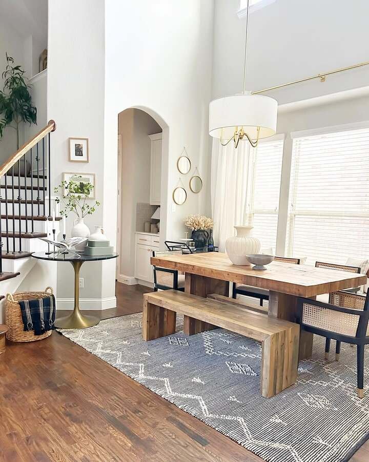 This one is such a nice mix of modern and warm. The tall windows with linen drapes soften the whole room instantly. The black rectangular chandelier adds contrast, and I love that it’s open and airy instead of bulky. The table is a pale wood tone, and the seating mix is smart: upholstered end chairs for comfort, and woven-back chairs for texture.