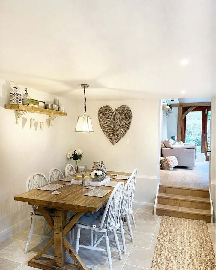This dining space feels sweet and a little quirky, but still fits neutral dining room decor because the colors stay calm. The heavy trestle table brings that farmhouse vibe, while the white chairs keep it light. The woven heart on the wall is the kind of thing that could look cheesy, but here it actually works because the room is simple and bright. The open shelf with little pieces and bunting adds personality without taking over.