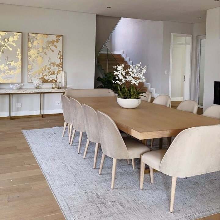 This setup feels smooth and grown-up. The long table is wide and simple, and the upholstered chairs look like they’re made for long dinners where people actually talk. The giant rug under everything softens the space, and the console table with large art panels makes the background feel calm instead of blank. Even the staircase in the back adds a cool architectural line.