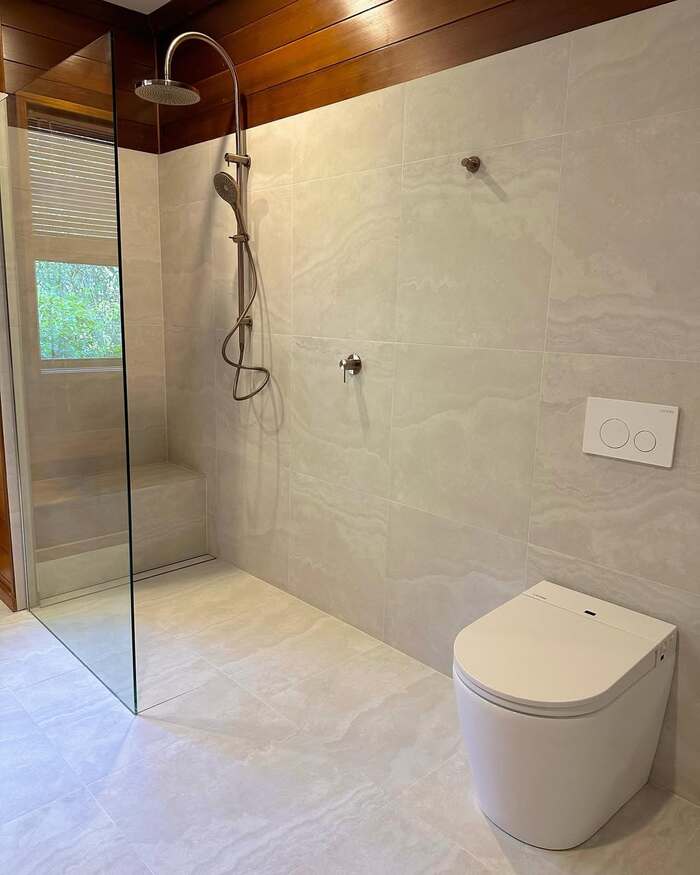A simple bench stretches under soft downlights, so shaving and scrubbing actually feels like a treat. Use a single, wide drain at the entry to keep the curbless look.