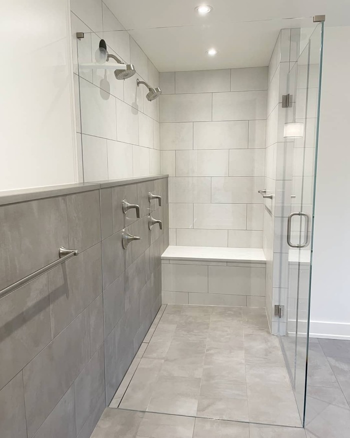 Moody, confident, a little bit rock star. Dark slate-look tiles on the walls make the white ceiling glow. The mixed gray floor tiles create a runway to the bench. Use one ceiling rain head and one handheld for daily life.