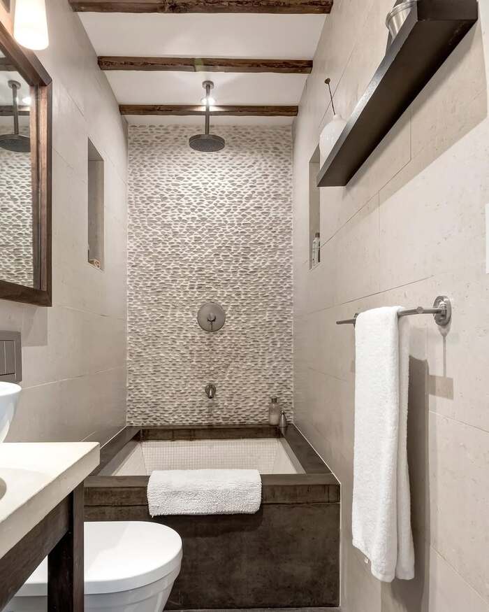 Hello texture. A vertical stripe of pebble tile catches the light and turns a tiny bath into a jewel box. I love the beams and the warm cream walls. If your bathroom is long and skinny like mine, borrow this trick.