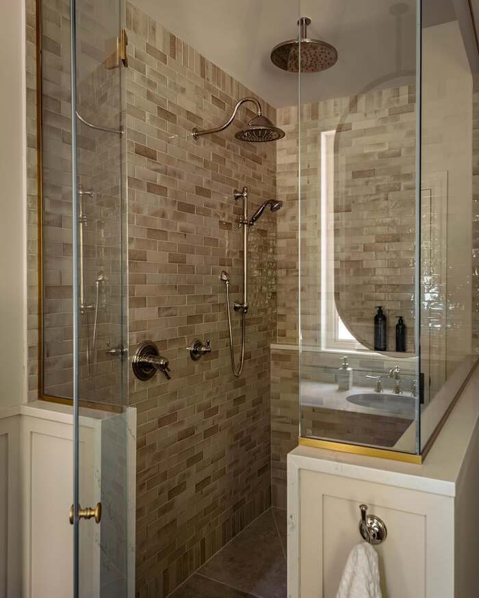 Warm cocoa tiles run straight up, which makes the ceiling feel taller. The brass rail and fixtures turn light buttery and cozy. A low curb and wide entry keep it easy to step in, and the rug outside warms bare feet.