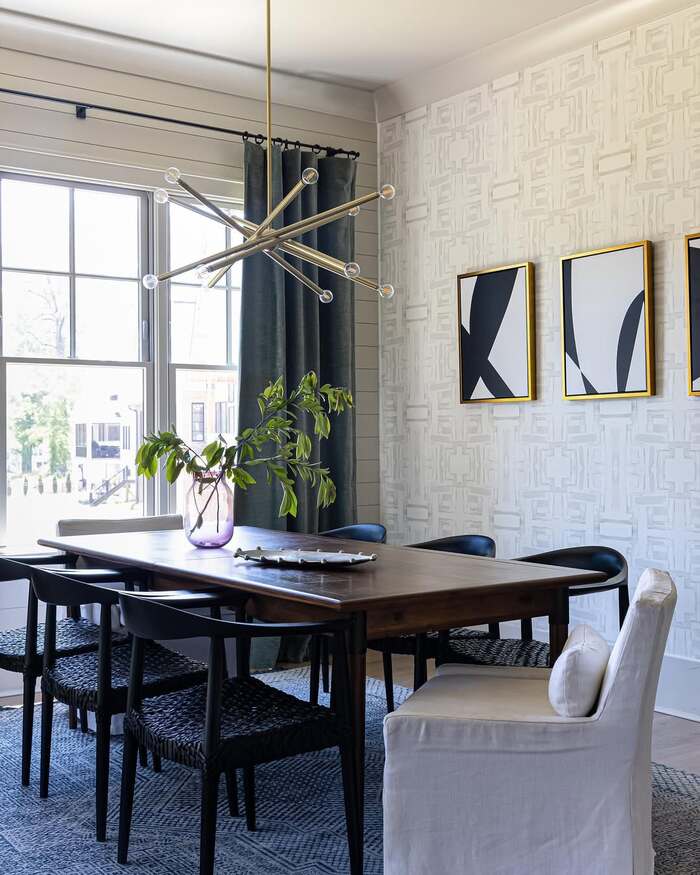 Black woven chairs, deep wood table, and three bold prints. The texture on the wall adds quiet depth. The brass starburst light brings energy without getting fussy.