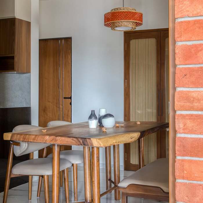 That live-edge slab table is the hero. The edges are imperfect in the best way, which gives soul. A clay colored pendant and rounded chairs keep the language friendly.