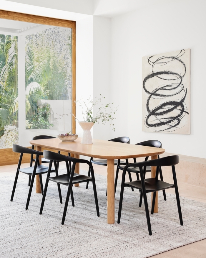 This room is crisp but not cold. Rounded rectangle table, matte black chairs, chunky knit rug. The big window does half the job, but the trick is restraint.