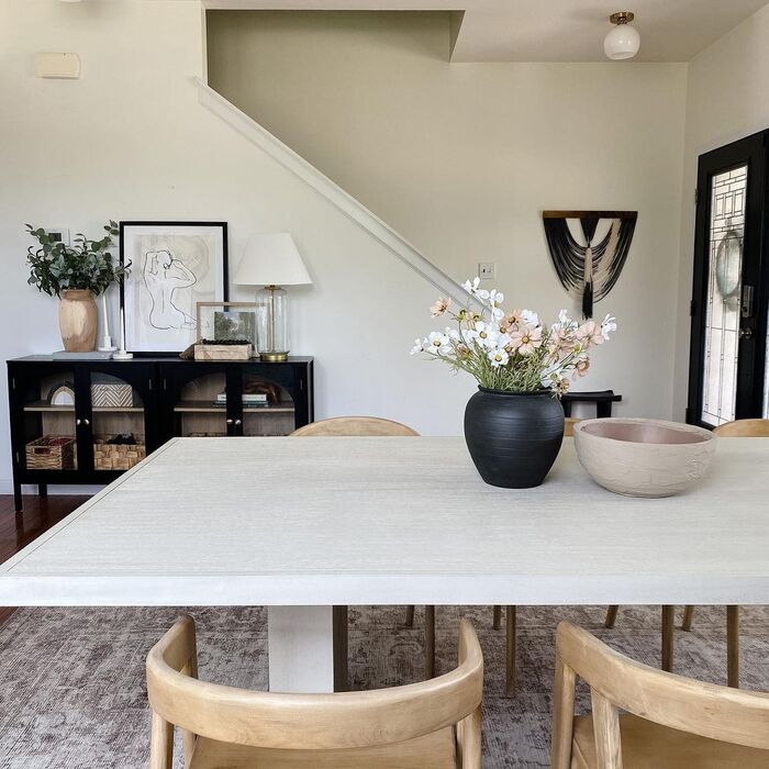 I love the quiet confidence here. A chalky square table, black cabinet, artwork leaned not hung. The flowers look like they came from the yard, not the store. That’s the heart of organic modern design dining room style. Nothing screaming. Everything useful.
