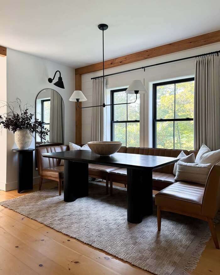 This is one of those nature inspired modern dining room ideas I pitch to families, because benches seat more people without more chairs. Use a flatweave rug so crumbs vacuum up quick.