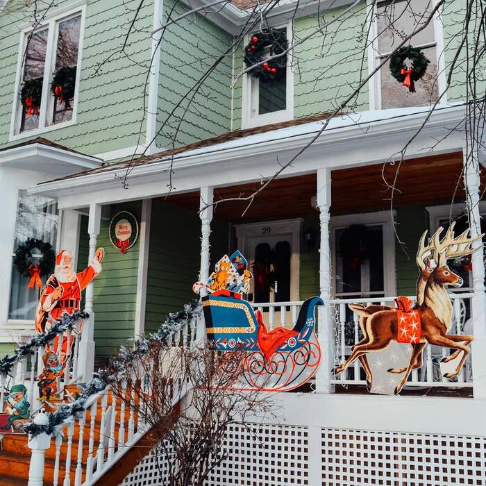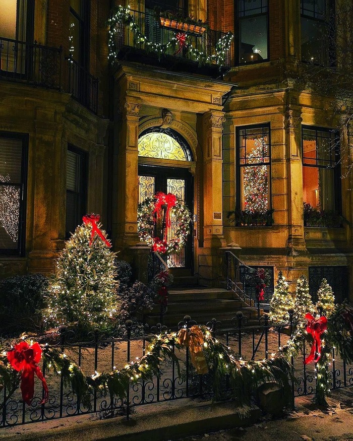 Brownstone charm with railing garlands, red bows, and glowing trees