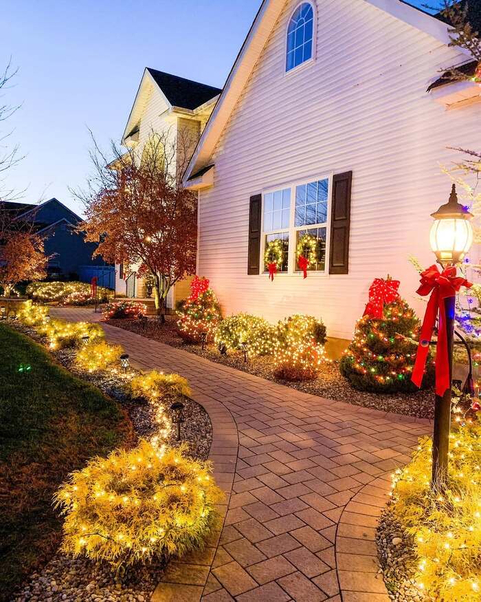 That winding path lit with warm nets over the shrubs is proof that coverage beats chaos. Net lights are fast and they look shockingly tidy. Lay the nets corner to corner over each bush, tuck loose edges under, and use two garden staples so wind can’t steal them. Repeat red bows on the window wreaths and the lamppost to create rhythm. The curve reads better when you add stake lights every four or five feet, just like musical beats.
